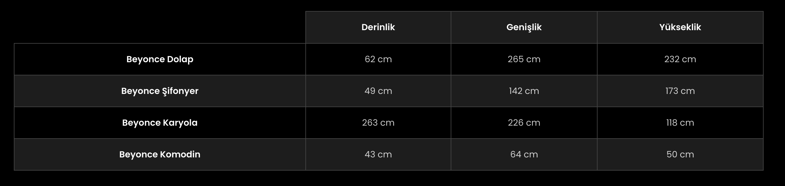 Şıklığı ve modern detaylarıyla odanızı baştan aşağıya dönüştürür. Yüksek kaliteli malzemelerle üretilen bu takım, uzun yıllar boyunca sağlamlığını ve estetik görünümünü korur. Geniş gardırop, şifonyer ve komodin gibi işlevsel depolama üniteleri, düzeni sağlarken, odanızı zarif bir şekilde organize eder. Takımın şık başlık ve rahat yatak, her gece keyifli bir uyku deneyimi sunar. Beyonce Yatak Odası Takımı, modern çizgileri ve zarif renk seçenekleriyle her tarzda iç mekâna mükemmel uyum sağlar. Eğer yatak odanızda konforu ve şıklığı bir arada arıyorsanız, Beyoncé Yatak Odası Takımı mükemmel bir tercihtir.